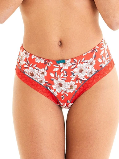 Shorty en microfibre imprimée au motif fleurs au trait et dentelle géométrique. Galon de dentelle sur l’ouverture des jambes avec piping contrasté. Noeud en satin à la ceinture. Fond doublé d’un gousset 100% coton.
