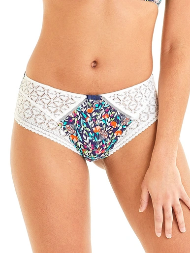 Shorty en microfibre imprimée au motif fleurs de printemps. Dentelle texturée géométrique. Noeud satin à la ceinture. Finition ouverture jambes en dentelle. Fond doublé d’un gousset 100% coton.