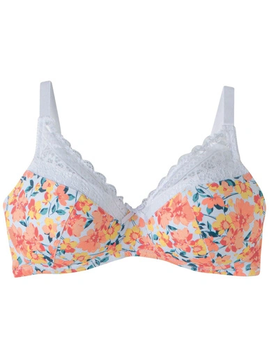 Soutien-gorge coques souples grand maintien Elena POMM’POIRE, en dentelle et microfibre imprimée au motif « floral ».