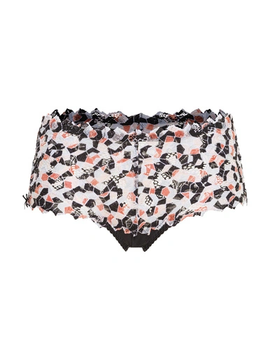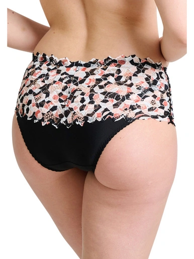 Culotte offrant plus de couvrance grâce à ses formes rassurantes. En effet, une large bande en dentelle recouvre les hanches à l’avant comme à l’arrière. Cette dentelle extensible est imprimée aux motifs floraux ou graphiques et a des finitions écailles. Le bas de la culotte est en microfibre pour plus de confort au porté. Les laçages et les petits noeuds sont placés sur les côtés afin d’habiller le haut de la cuisse.