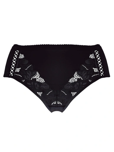 Culotte gainante avec large empiècement de dentelle extensible devant. Lien lacé et noeuds satin sur les côtés. Elastique plat à la taille haute.