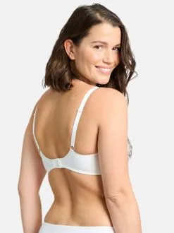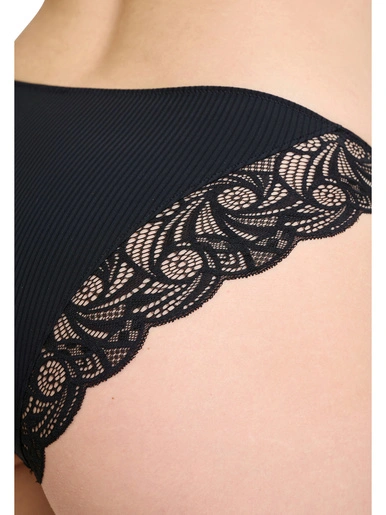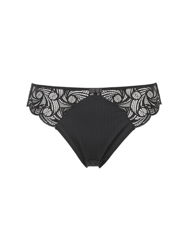 Ce slip à couvrance modérée est en maille texturée et en dentelle au motif en forme de volutes. La partie centrale de l’avant comme de l’arrière est en microfibre très confortable tandis que les côtés sont en dentelle ajourée à écailles ce qui lui donne un look chic et moderne. Le dos aux finitions plates ne marque pas sous les vêtements grâce à sa bande en dentelle le long de la fesse. Noeud plat texturé à la taille.