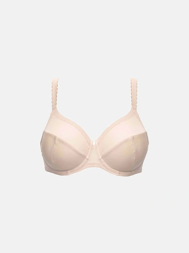 Soutien-gorge à armatures et à la construction 3 tranches. Les bonnets sont entièrement doublés de tulle. Jeux de mix-matières avec la transparence du tulle sur le décolleté laissant transparaitre un motif festonné « effet vague » et avec une microfibre unie. Deux empiècements en tulle sont disposés à l’arrière et font le lien avec les bretelles ce qui apporte une touche de fantaisie. Bretelles ajustables et fantaisie « effet vague ».